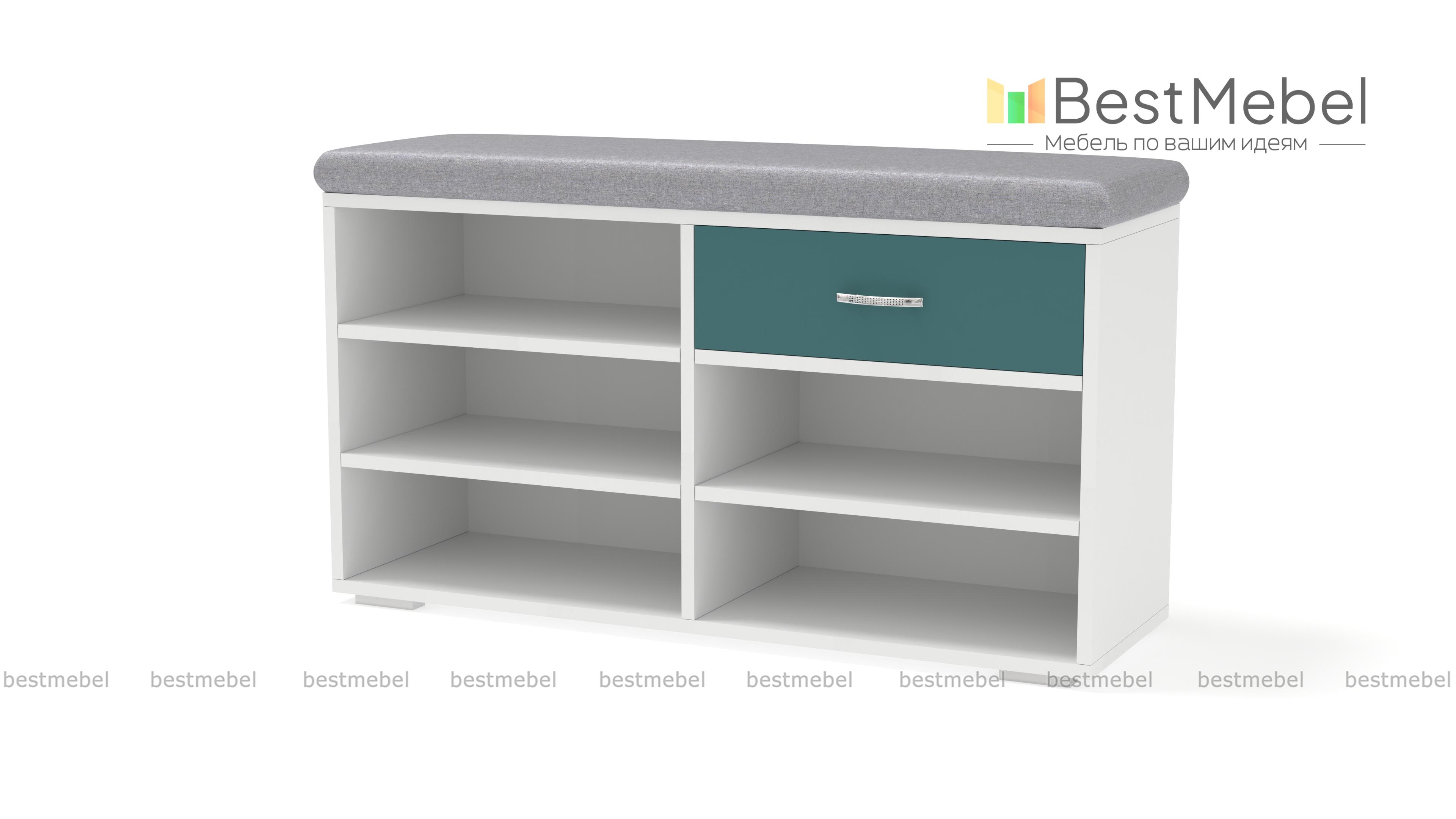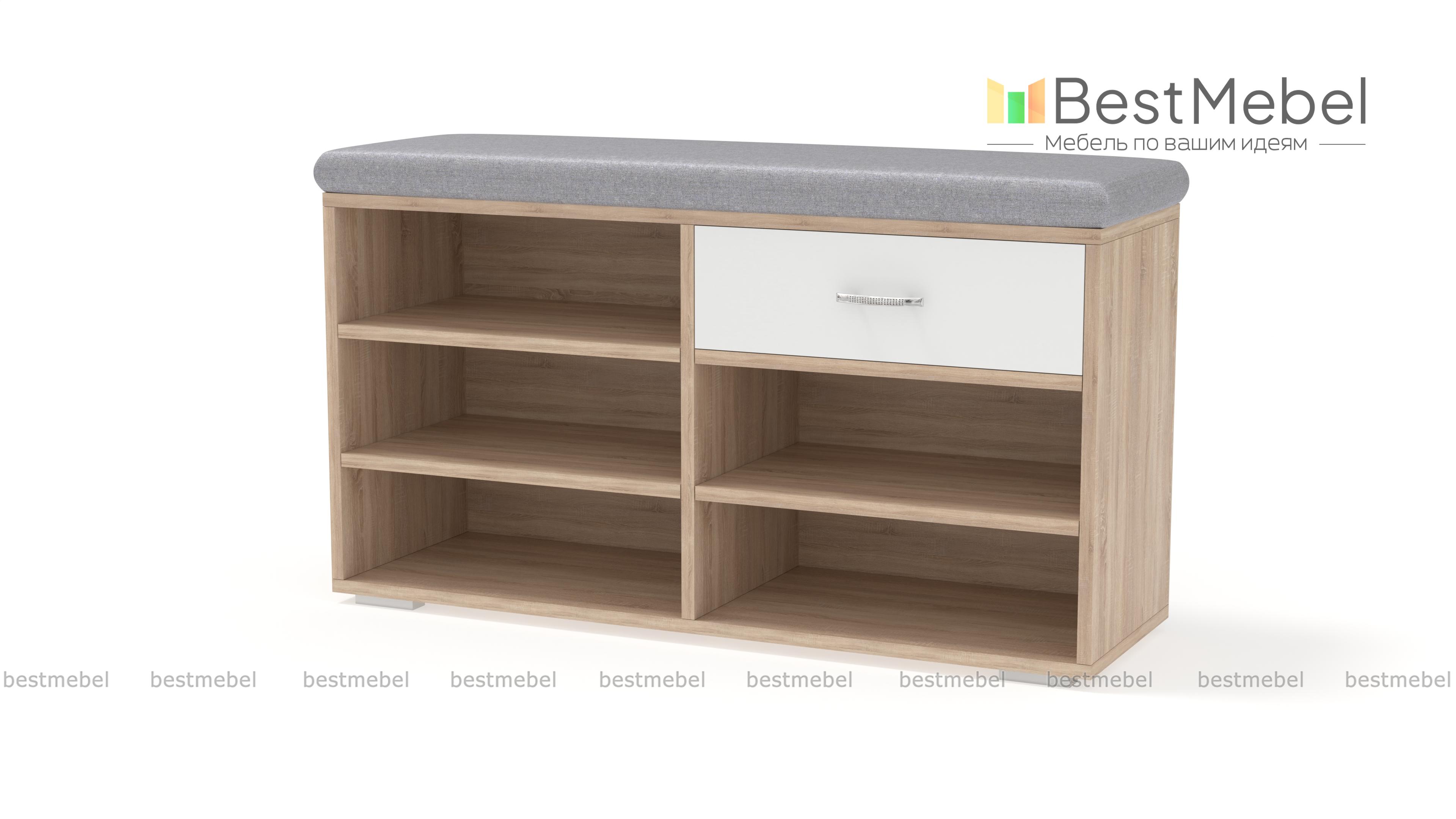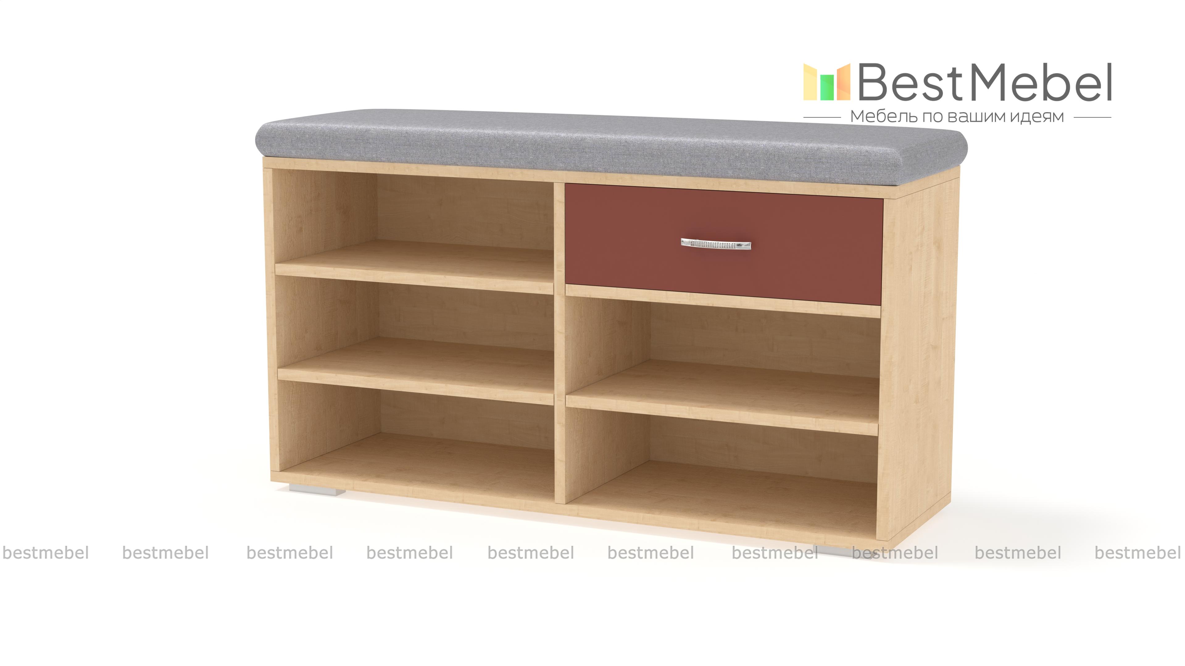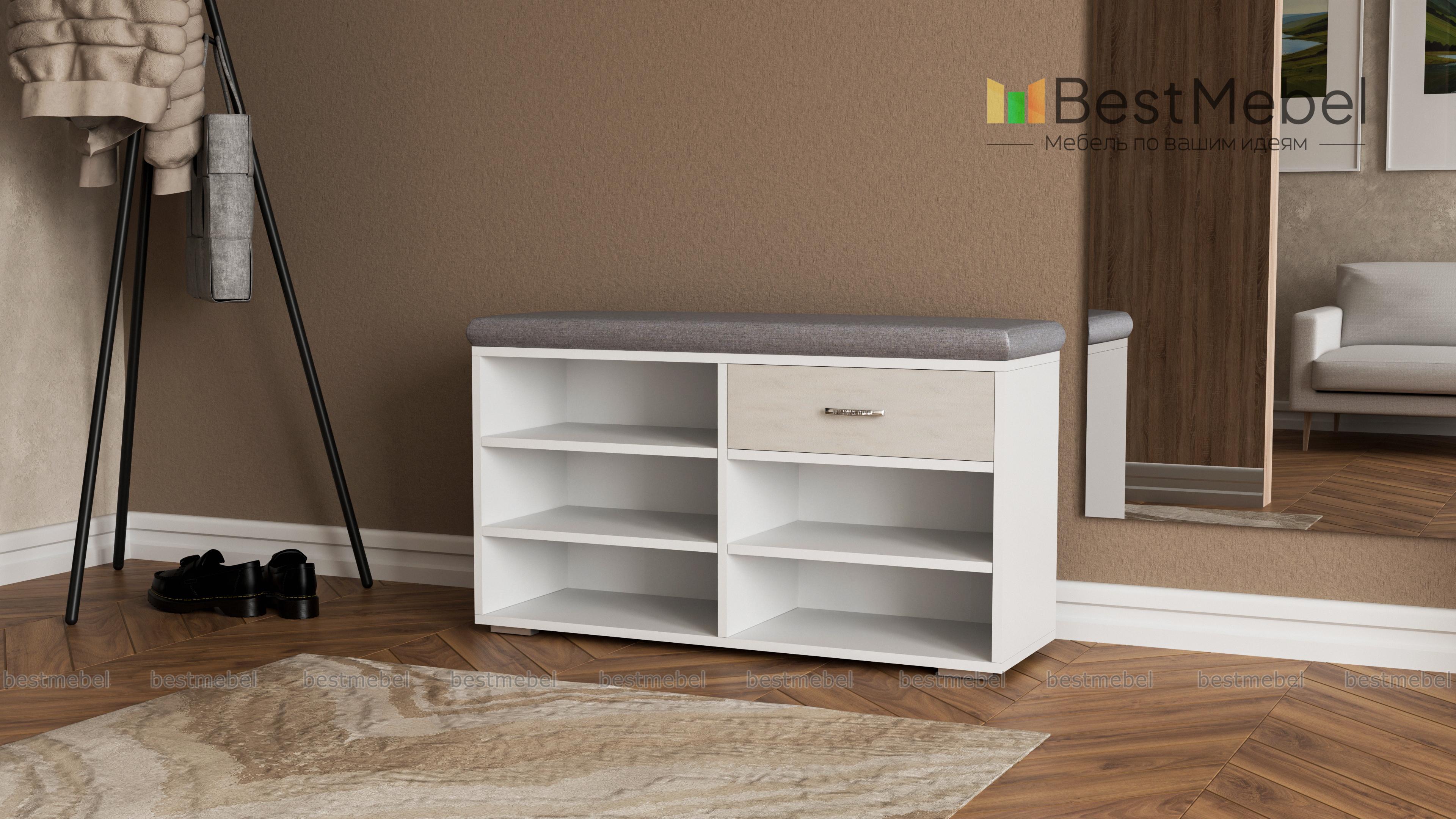 Отличная обувница, сразу мне приглянулась, потому что несколько полочек для обуви, чтобы ничего не мешалось при входе+ удобный ящик для мелочи. На сайте большой выбор материалов и расцветок сидушки. Обувница была частью от заказа в прихожую №00000667194 (Э667194).