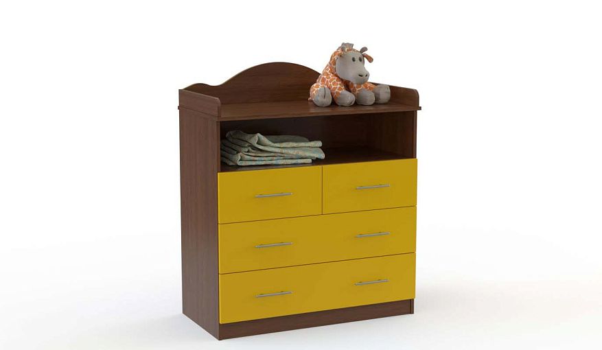 Пеленальный комод Фиалка 4 BMS BMS – это изящная модель с фигурно вырезанным бортиком вдоль задней стенки. Для удобного хранения средств гигиены и прочих мелочей предусмотрены два малых выдвижных ящика и просторная ниша, а в двух больших разместятся постельное белье, одежда и игрушки малыша. Встроенная пеленальная поверхность закрыта скругленными для безопасности бортиками. Купить пеленальный комод Фиалка 4 BMS вы сможете в нашем интернет-магазине с выбором фурнитуры и цвета по каталогу.