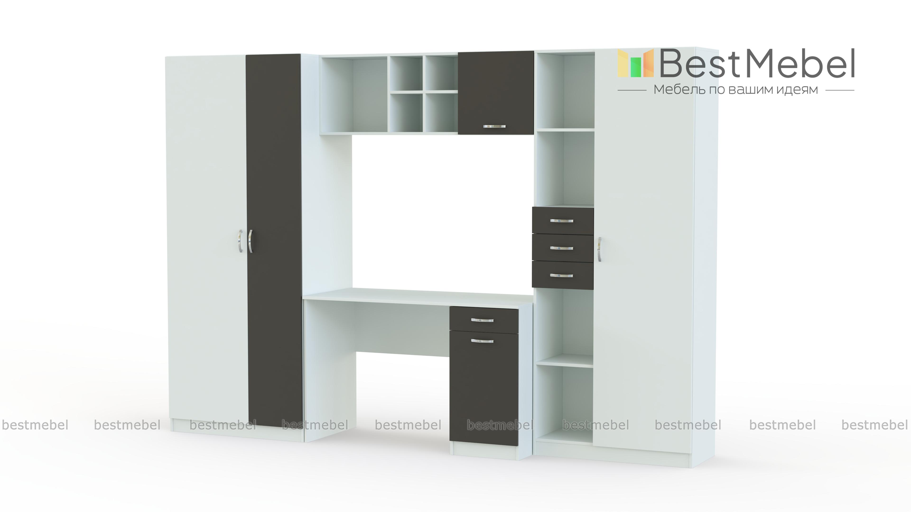 Вместительная и функциональная детская стенка Симба Композиция 1 BMS решит в комнате ребенка проблемы с размещением рабочего места и хранением самых разнообразных вещей. В комплект входят письменный стол с тумбой, комбинированный стеллаж, навесная полка и двухдверный одежный шкаф. Книги, игрушки, школьные принадлежности и предметы гардероба всегда будут в порядке и под рукой. Не оставит равнодушными детей и взрослых и яркая, контрастная расцветка фасадов.