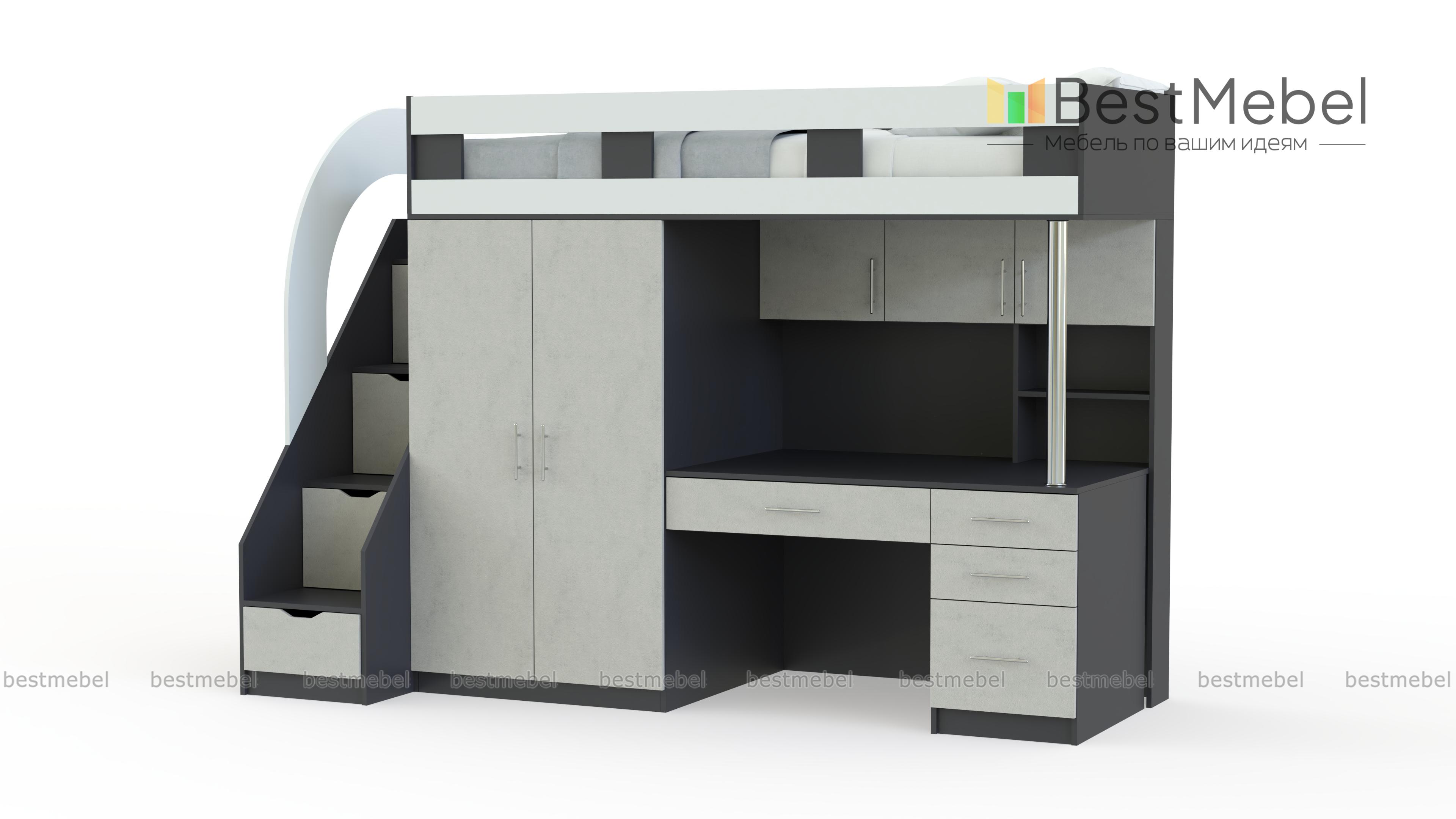 Кровать-чердак с рабочей зоной Мираж 5 BMS отличается современным дизайном, компактными размерами и функциональностью. Вы сможете обустроить комфортную зону отдыха, полноценное рабочее место и аккуратно разместите вещи ребенка. В комплекте кровать с защитным бортиком, лестница-комод, распашной шкафчик для одежды и письменный стол с выдвижными ящиками для мелочей и надстройкой с полками. Купить кровать-чердак с рабочей зоной Мираж 5 BMS приглашаем выгодно в наш интернет-магазин.