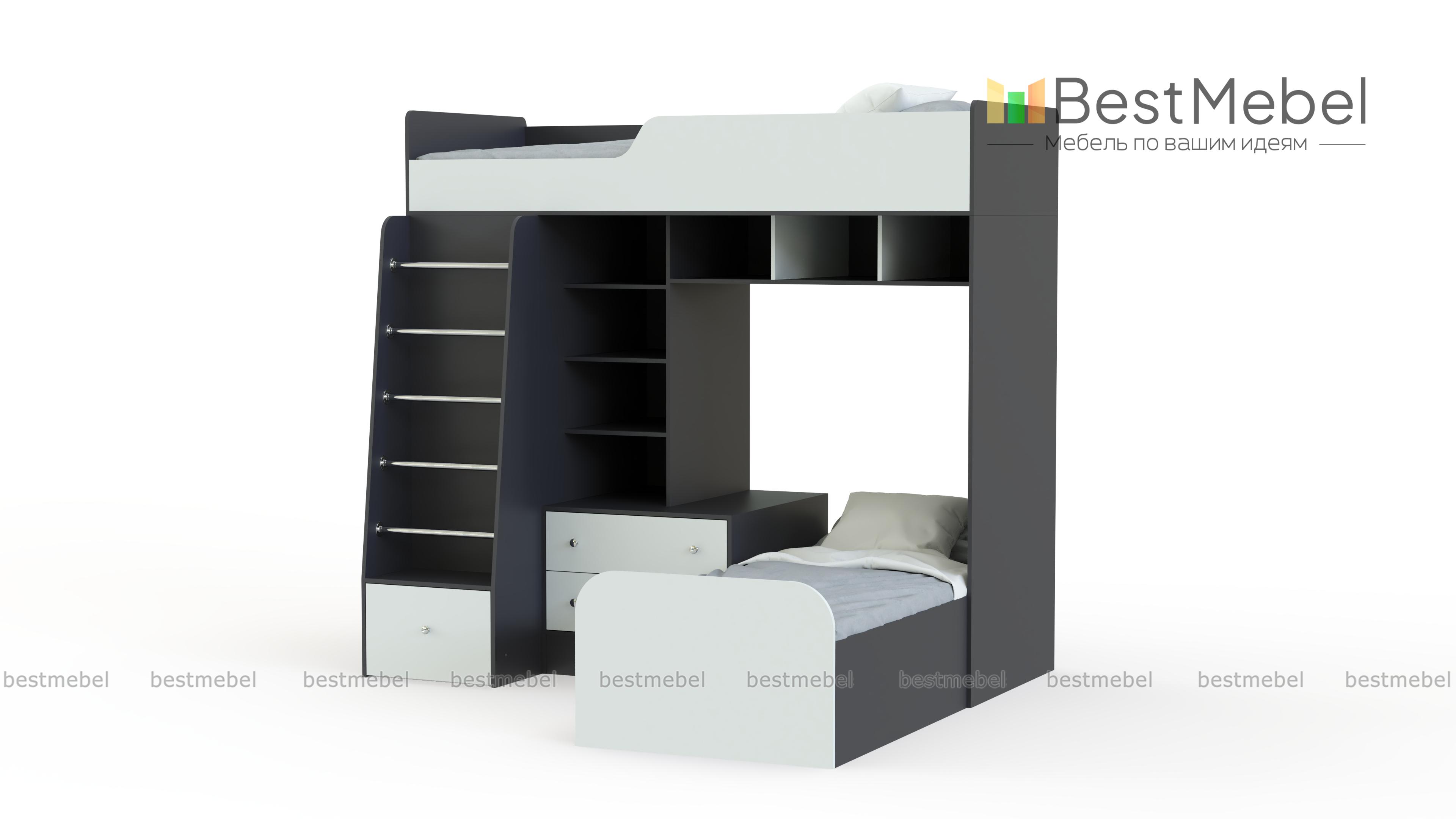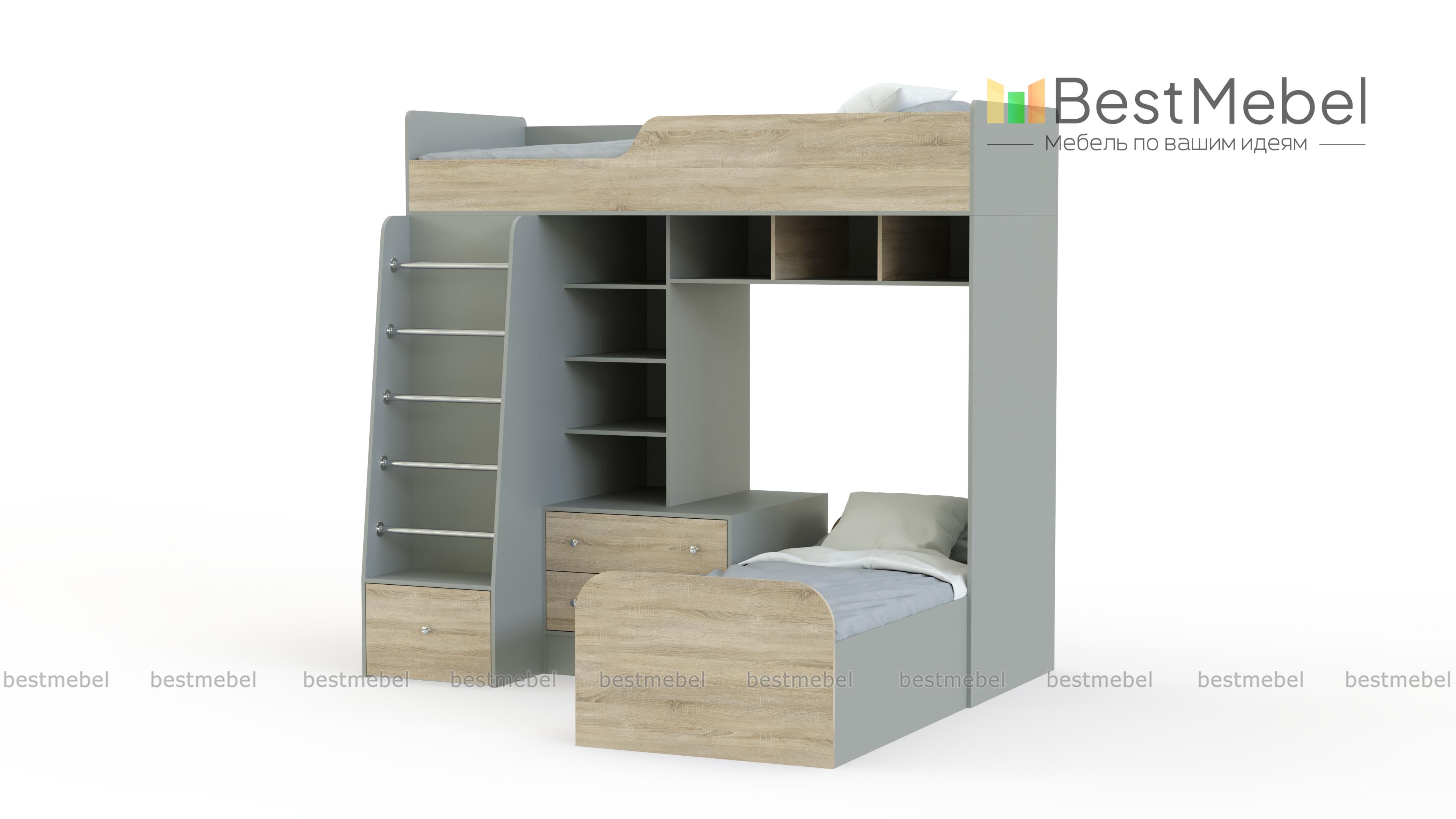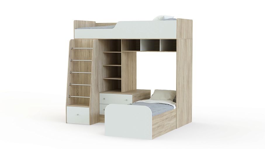 Угловая двухъярусная кровать Астра-4 BMS это современный мебельный комплекс, оборудованный всем необходимым для комфортного сна и хранения вещей двух детей. Выполненная в сочетании поверхностей древесного оттенка и белых вставок, кровать гармонично впишется в интерьер детских и молодежных комнат. В комплект входят расположенные на разных ярусах кровати, открытые полки, тумба, лестница с ящиком в основании и распашной шкаф для одежды. Скругленные углы делают пользование безопасным. Купить угловую двухъярусную кровать Астра-4 BMS приглашаем в наш интернет-магазин.