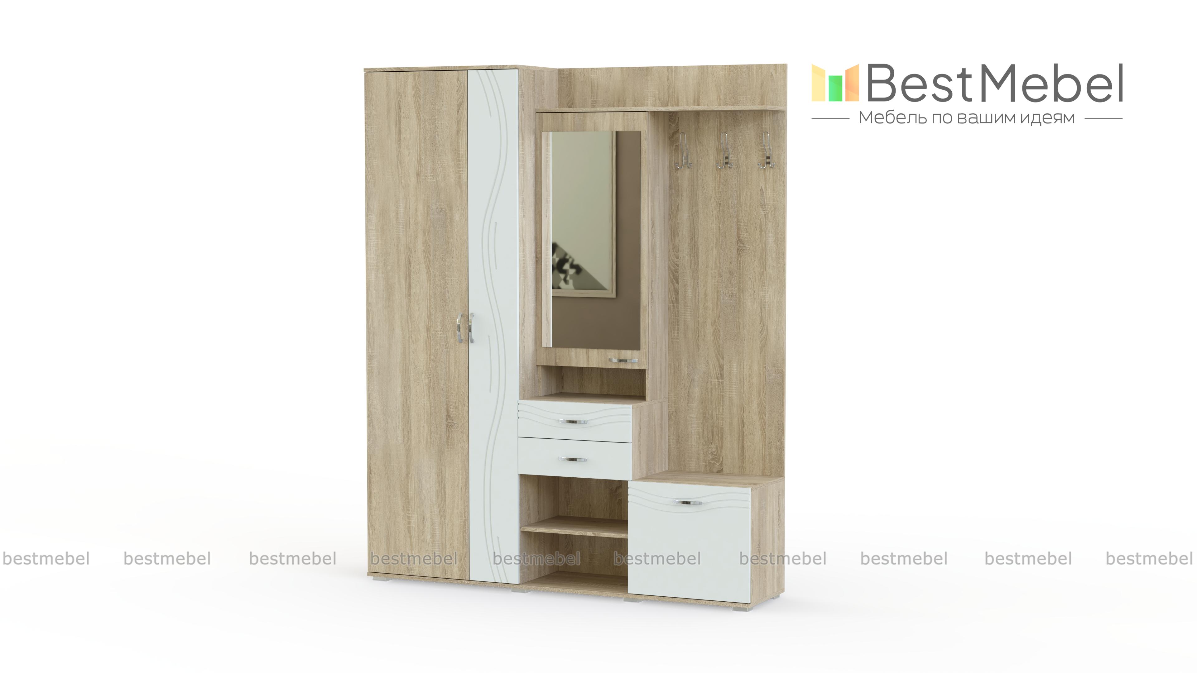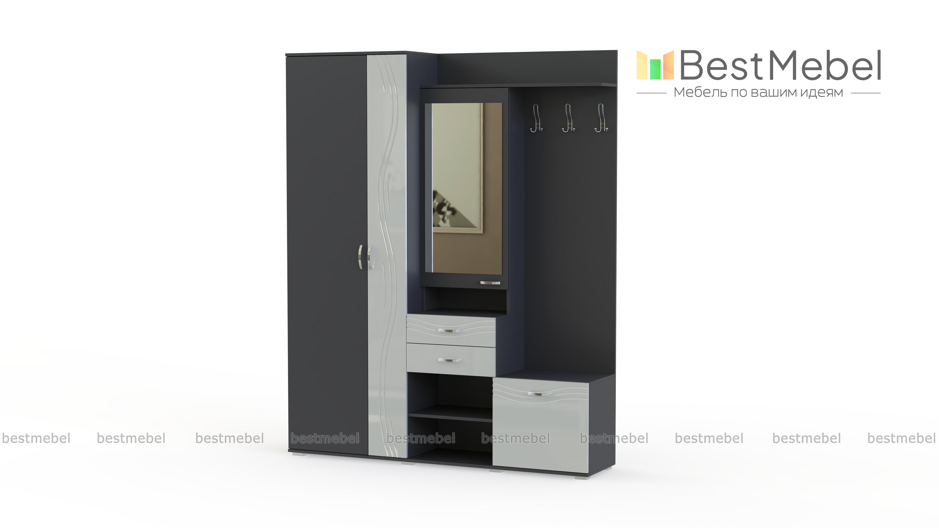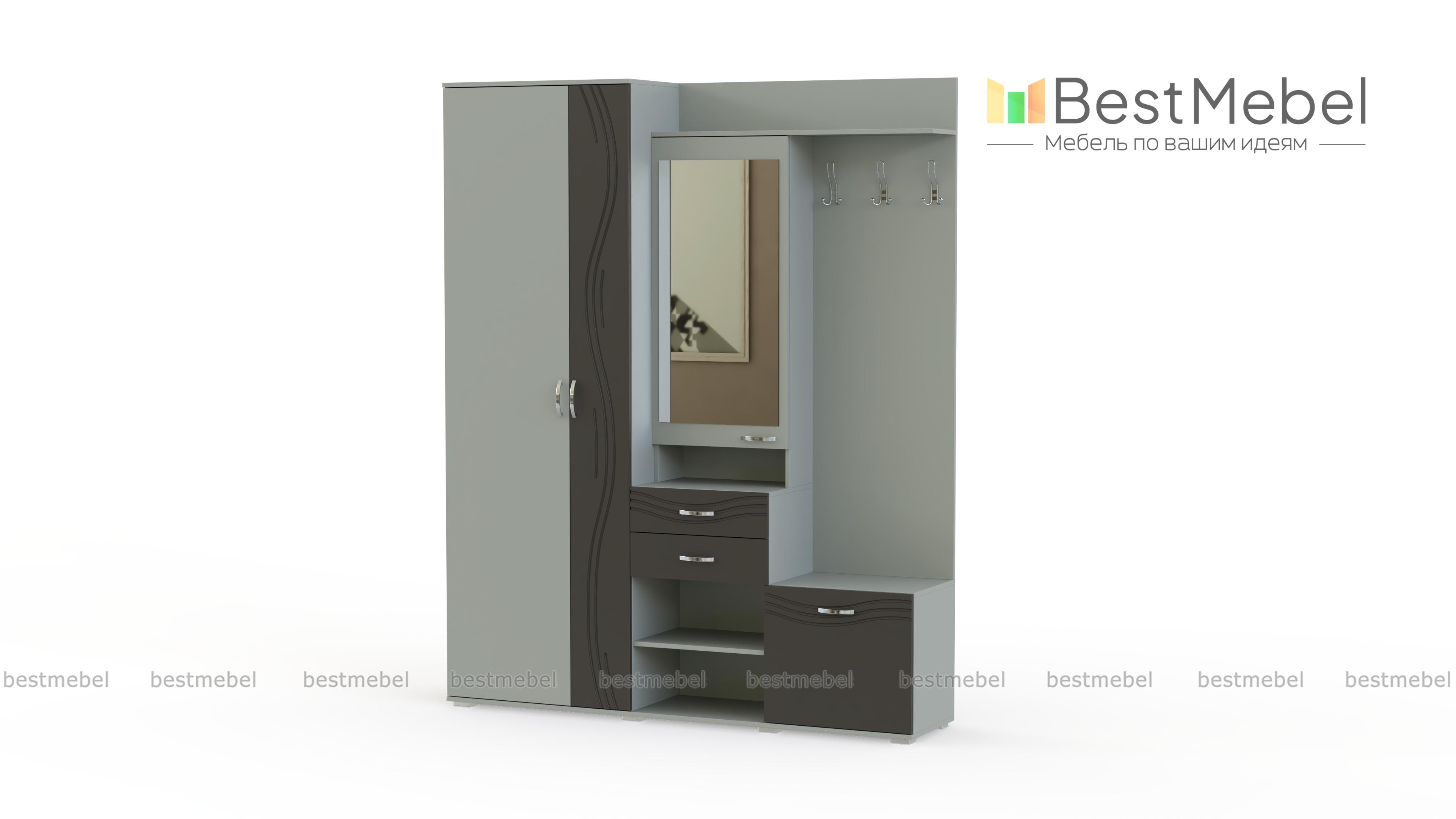 Средние габариты прихожей "Стиль-2" BMS подойдут как просторным, так и малым помещениям. В оформлении классические элементы гармонично сочетаются с современными решениями. Прихожая оборудована вместительным платяным отделением, открытой панелью с крючками, закрытой обувницей, выдвижными ящиками и полками. Вместительный распашной шкафчик для мелочей дополнен большим зеркалом на дверце. Фасады, выполненные в нейтральных оттенках под массив дерева и однотонном цвете с декором, легко впишутся в интерьер.