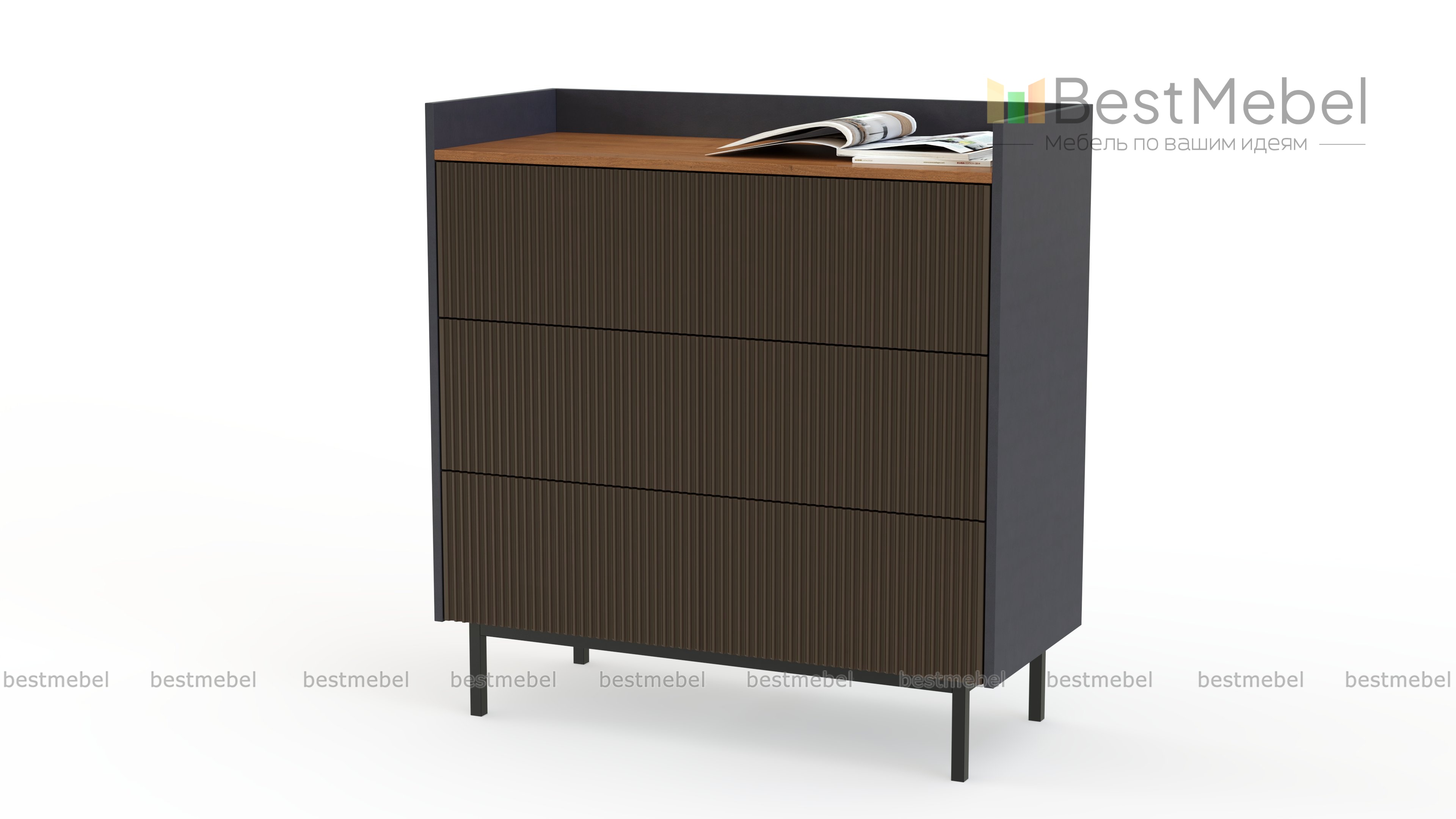 Комод Николь Нео 12 BMS выполнен в винтажном стиле, эффектно дополняя гостиные, спальни и прихожие. Небольшой комод с тремя выдвижными ящиками для одежды или домашнего текстиля оборудован столешницей с бортиками, на которой удобно размещать важные мелочи и декор. Рифленые и гладкие поверхности темных тонов скомбинированы с теплыми , а завершают оригинальный дизайн высокие металлические опоры и изящные торцевые ручки.