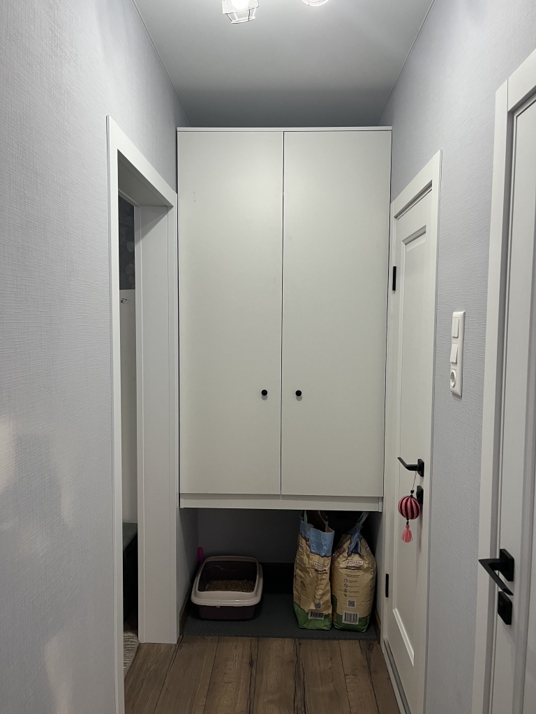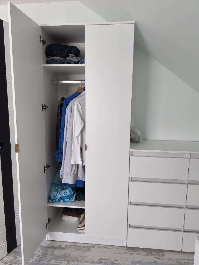 Шкаф красивый. Удобно, что можно заказать свой размер, выбрать комплектующие. Наша ошибка в выборе глубины шкафа: при расположении штанги в ширину и глубине 45 см "плечики" не умещаются. У нас крючок "плечиков" вращается, поэтому повесили чуть на искоса.