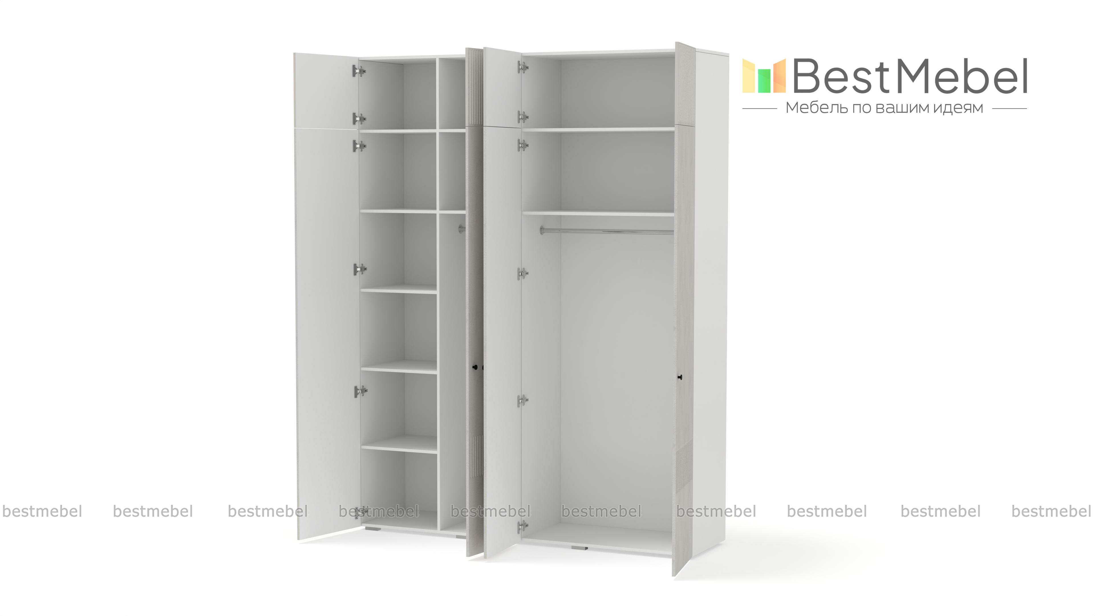 Шкаф распашной Джосс 10 BMS с четырьмя дверцами и антресолью можно разместить в разных комнатах: небольших спальнях, прихожих и детских. Оригинальные оттенки корпуса и фасада создают комфортную атмосферу в помещении, стильный акцент в отделке — фрезерованный орнамент. За дверцами справа скрыты штанга и полка, а слева — узкая платяная секция и бельевой стеллаж. Купить шкаф распашной Джосс 10 BMS с выбором размеров, цвета и фурнитуры вы сможете недорого в нашем интернет-магазине.