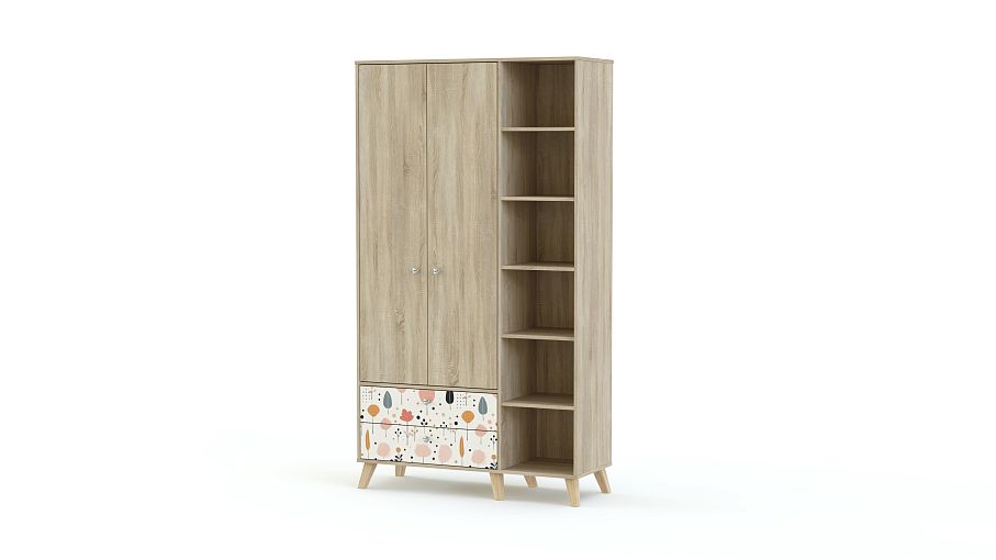 Шкаф распашной Эльза 4 BMS с высокими ножками гармонично смотрится даже в маленькой комнате. Система хранения включает в себя отделение со штангой, два выдвижных ящика и стеллаж, на полках которого будут на виду книги, игрушки, органайзеры с мелочами. Теплая природная гамма делает интерьер уютнее, а в качестве декора использован нежный рисунок-фотопечать. Купить шкаф распашной Эльза 4 BMS вы сможете в нашем интернет-магазине, подобрав размеры, цвет и фурнитуру.