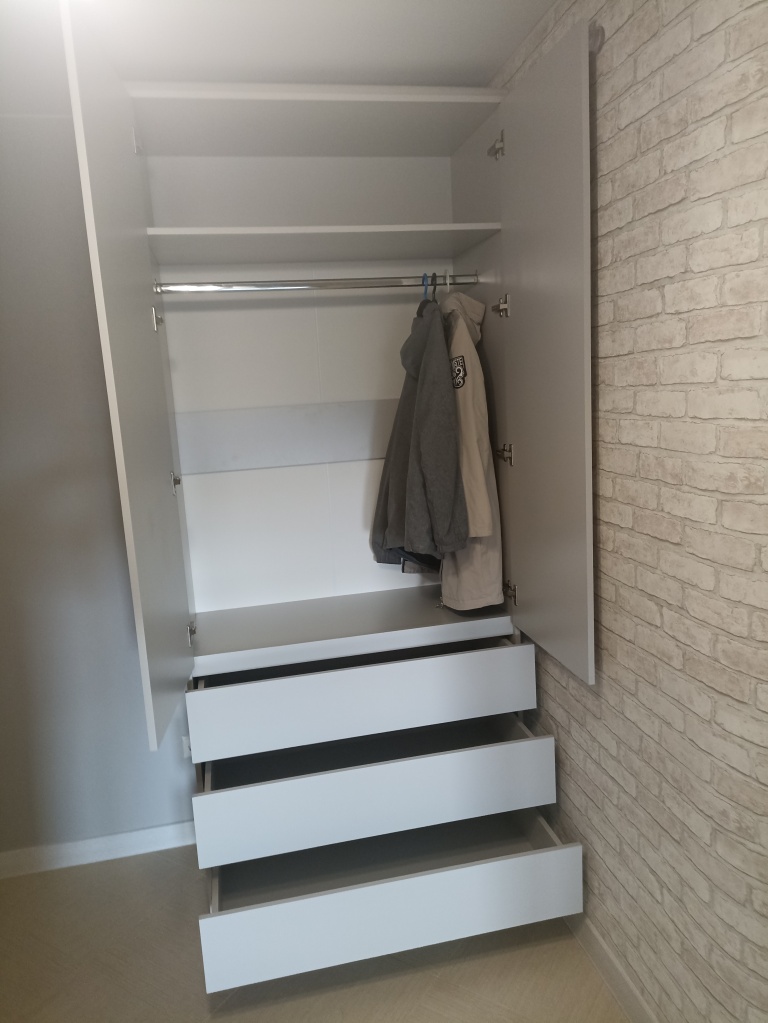 Заказ 00000250759. Заказали шкаф шириной 70 см, с полками вместо штанги. Вместо русек заказали вырез. Всё получилось идеально. Собирали сами.