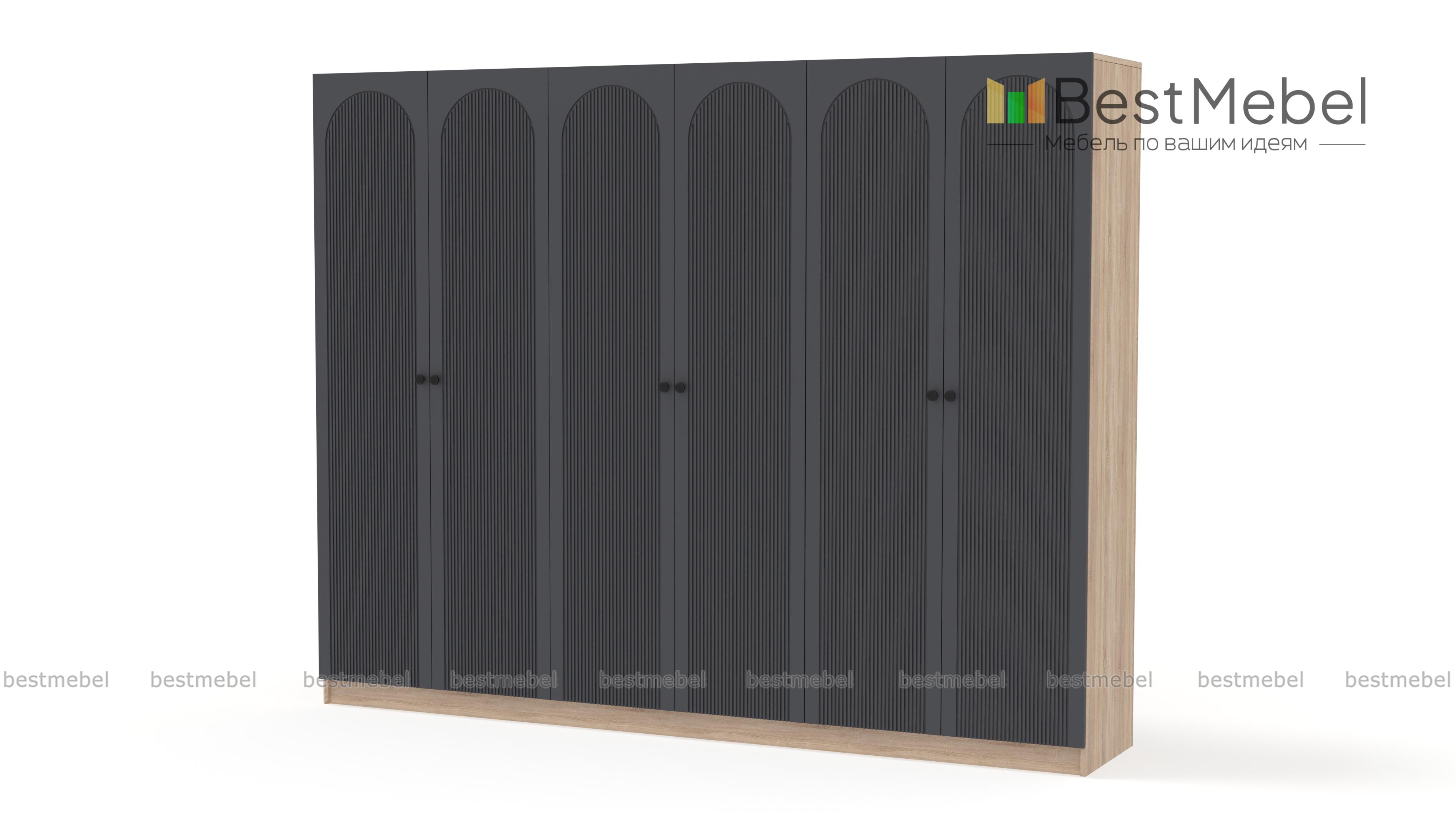 Шкаф распашной Рене 35 BMS — это отличная вместительность трех платяных отделений и современная эстетика. Фасад шестидверной модели с арочным декором и фрезеровкой красиво сочетается с корпусом в древесных тонах. Качественные материалы — ламинированная плита и МДФ, и надежная фурнитура делают пользование комфортным и долговечным. Купить шкаф распашной Рене 35 BMS вы сможете на сайте нашего интернет-магазина с изготовлением по индивидуальным размерам.