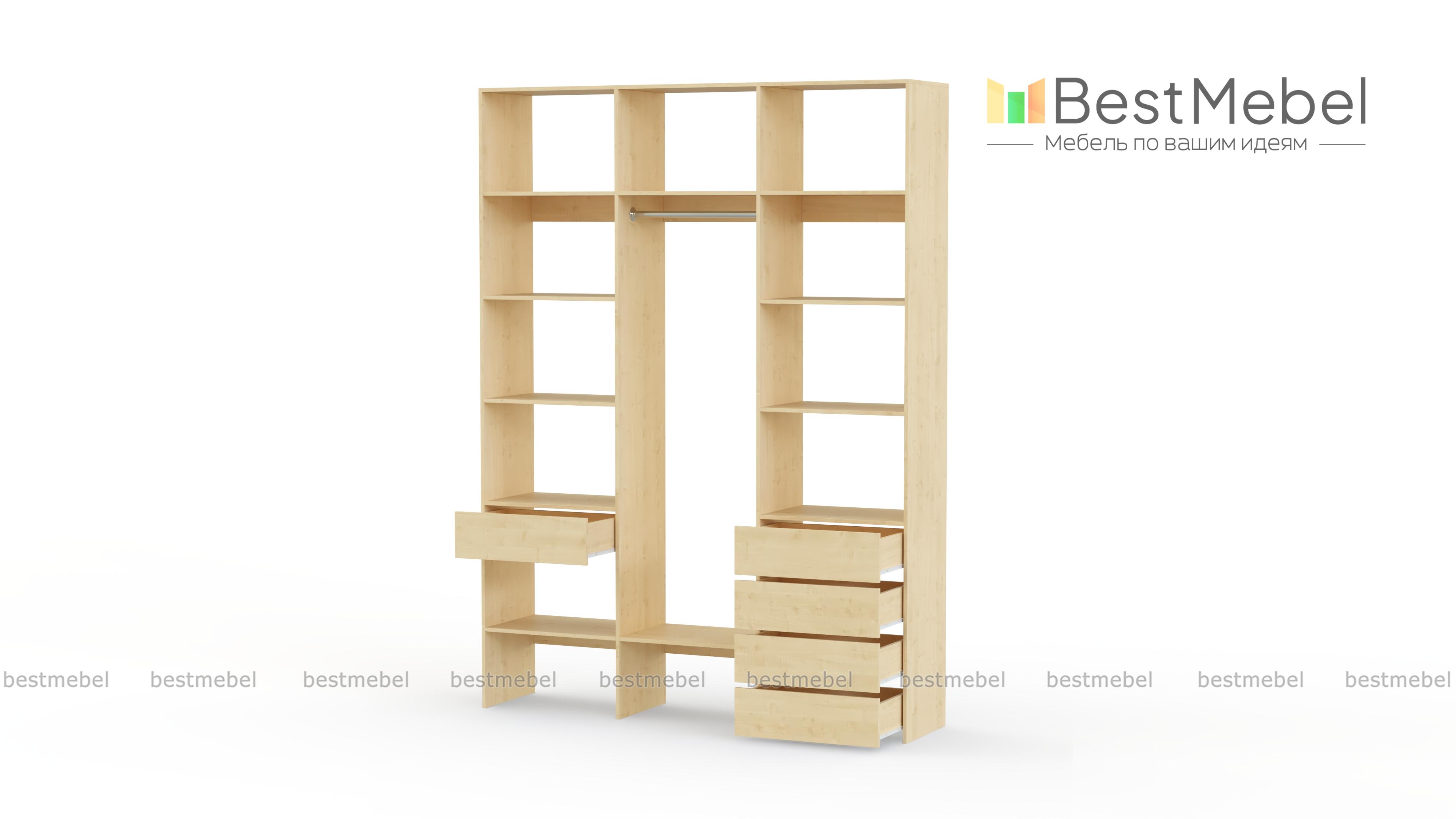 Стеллаж для одежды Мирта 10 BMS поможет легко поддерживать порядок в вашей прихожей, спальне или гардеробной. Все вещи будут на виду и под рукой благодаря продуманной системе открытых полок и выдвижных ящиков с платяной секцией в центре. Стеллаж выполнен из прочной ламинированной плиты, что гарантирует ему долгий срок службы и эстетичный вид. Купить стеллаж для одежды Мирта 10 BMS, изготовленный по индивидуальным размерам, вы сможете недорого в нашем интернет-магазине.