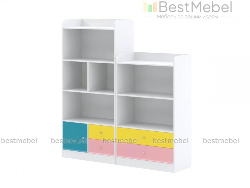 Стеллаж Радуга 4 BMS включает в себя два модуля – низкий, оборудованный открытыми полками и выдвижными ящиками, и высокий, дополненный распашным отделением. Практичная композиция позволит разместить любимые книги ребенка, игрушки, принадлежности для творчества и многое другое. Гармонично впишется в интерьер современной детской сочетание нейтрального белого с цветными матовыми вставками. Купить стеллаж Радуга 4 BMS приглашаем в наш интернет-магазин по доступной цене.