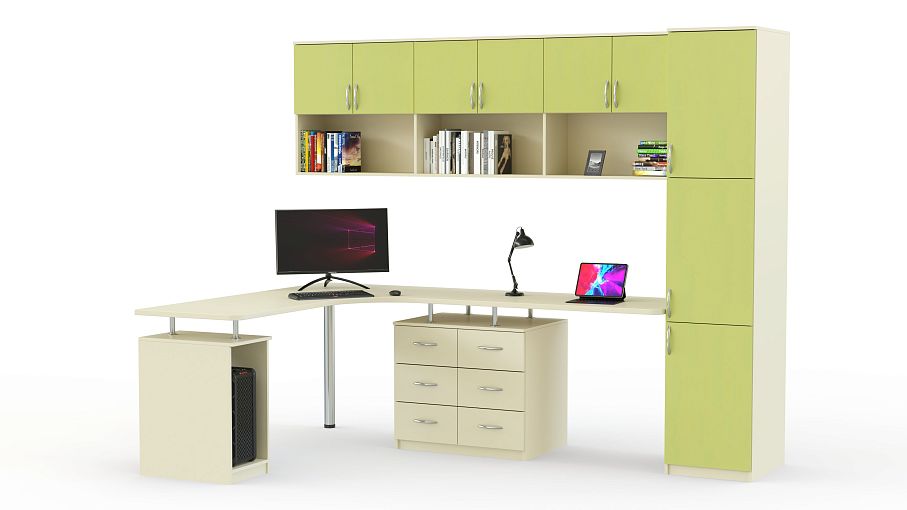 Угловой письменный стол для двоих Фреско 41 BMS, выполненный в сочетании теплых ванильных тонов и яркого фисташкового, гармонично дополнит интерьер современной детской. Многофункциональная композиция, объединившая два рабочих места и продуманную систему хранения, значительно сэкономит полезную площадь. Разместить все необходимое для комфортной учебы помогут тумба с выдвижными ящиками, секция под системный блок, пенал, глухие и открытые навесные полки. Купить угловой письменный стол для двоих Фреско 41 BMS приглашаем в наш интернет-магазин.