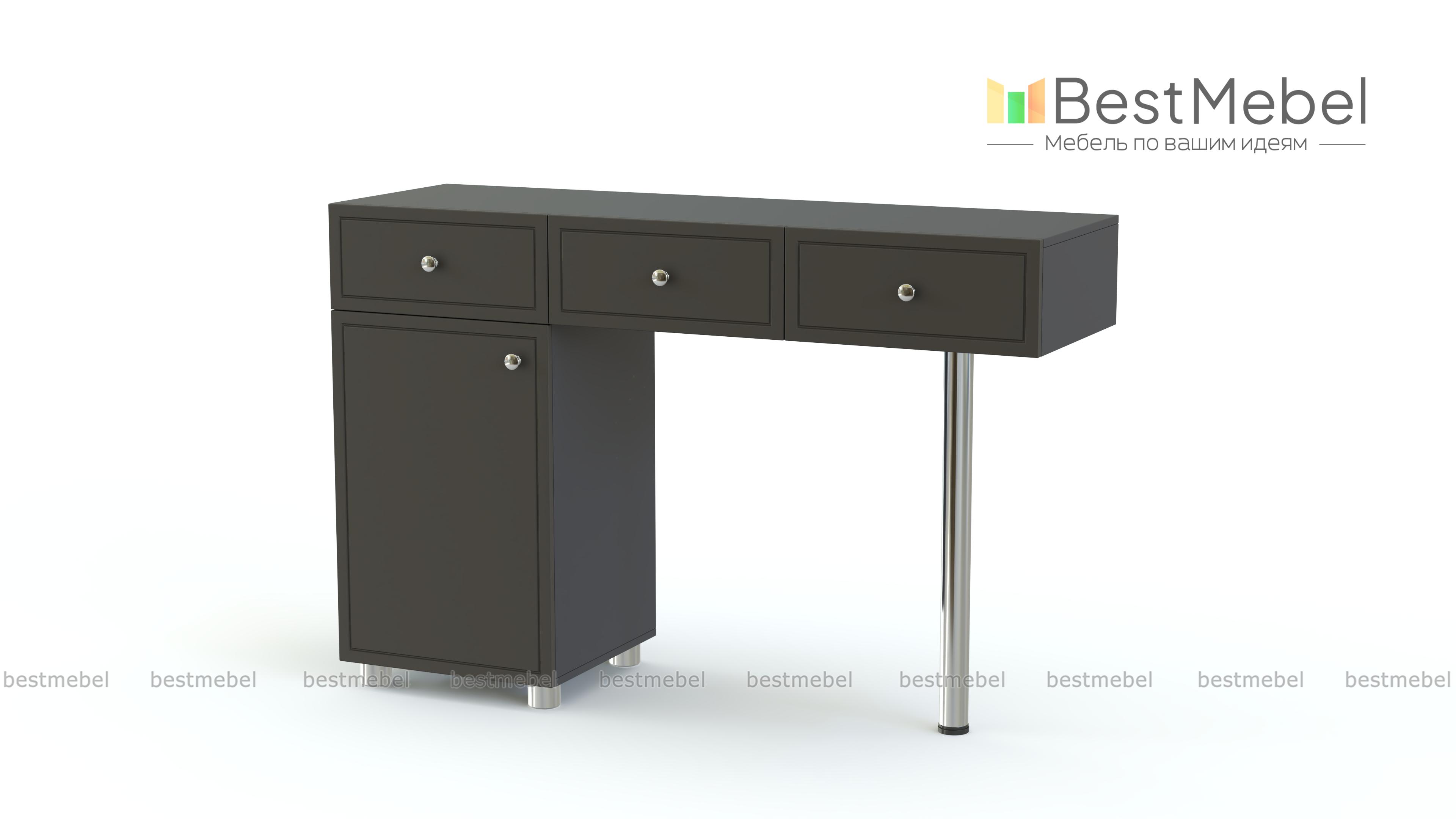 Туалетный столик Ноче СТ-11 BMS представляет собой элегантную консоль с тремя выдвижными ящиками, которую поддерживают распашная тумба и регулируемая хромированная опора. Удобная система хранения и просторная столешница позволят разместить под рукой все необходимые мелочи и сделать уход за собой комфортным. Фасады в светлых тонах декорированы фрезерованными линиями и дополнены ручками-кнопками. Купить туалетный столик Ноче СТ-11 BMS для современной спальни приглашаем в наш интернет-магазин.