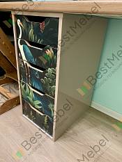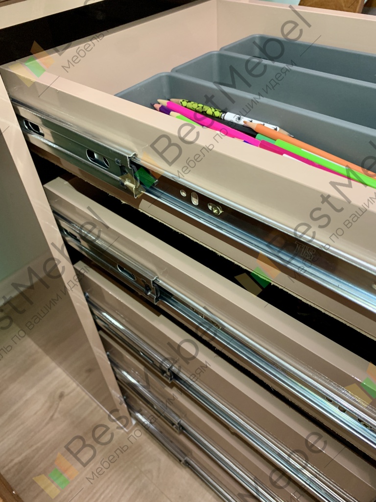 в этом заказе всё индивидуально: глянцевый корпус, в т.ч. задняя стенка, скрытые крепежи, шариковые направляющие с доводчиком, фотопечать, материал мдф. Получилось мощно! Мы довольны. Выполняет функцию разделителя под детским столом.