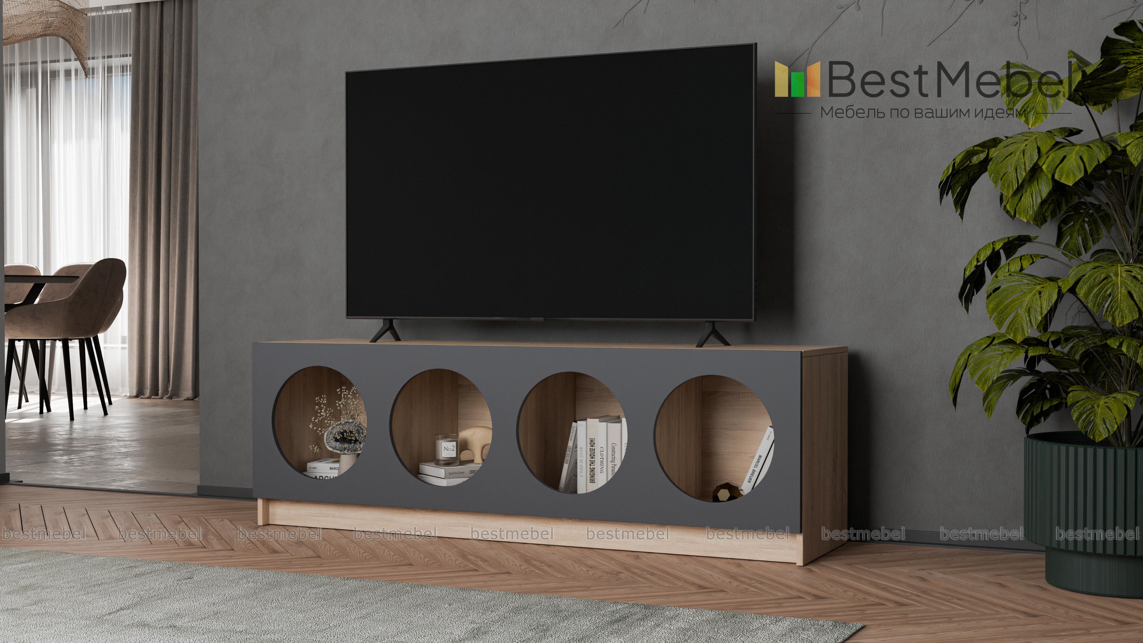 Тумба под ТВ Руди 7 BMS будет выполнять не только практическую, но и эстетическую функцию в интерьере. Четыре полки с большими круглыми вырезами станут прекрасным фоном для книг и журналов, пластинок или любимого декора. Корпус с широкой прочной столешницей под ТВ выполнен из ламинированной плиты древесного оттенка, фасад — контрастная, устойчивая к износу МДФ. Купить тумбу под ТВ Руди 7 BMS с выбором цветовой гаммы и нужного размера вы сможете в нашем интернет-магазине.